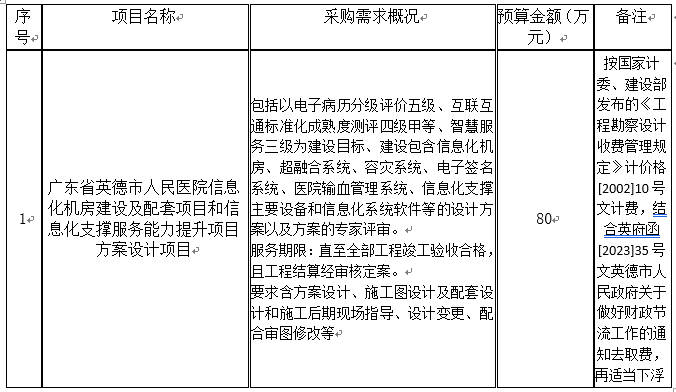 为便于供应商及时了解政府采购信息,现就广东省英德市人民医院信息化机房建设及配套项目和信息化支撑服务能力提升项目方案设计需求征集,欢迎各企业提供相关资料和报价,征集信息如下:
