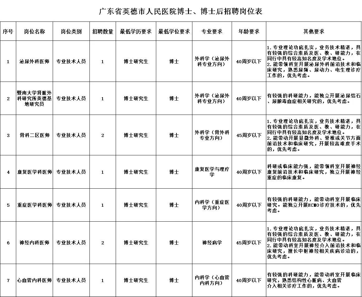 详见附件1《广东省英德市人民医院博士、博士后招聘岗位表》。