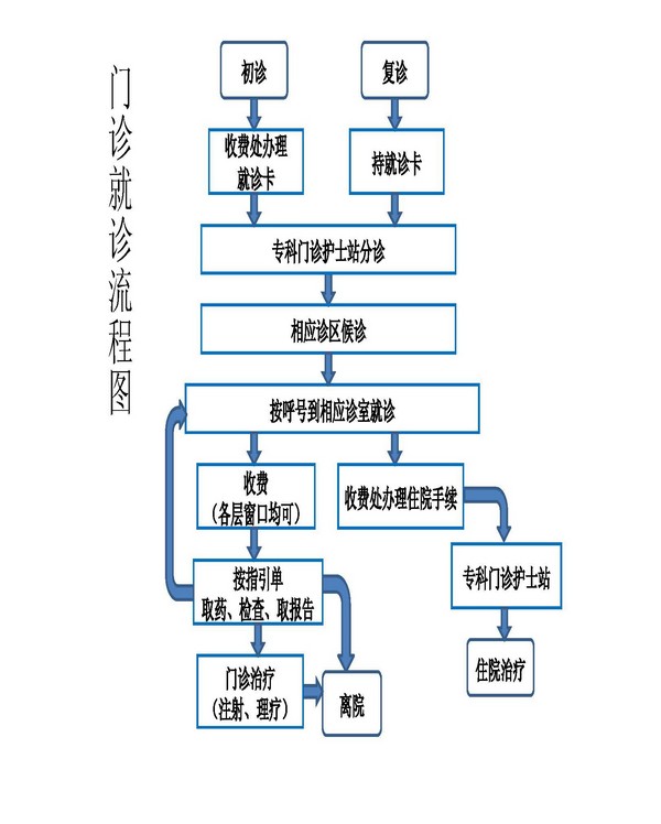 收费处挂号-->相应科室就诊-->凭处方到收费处缴费-->有输液的到输液大厅输液或有药品带回的到药房取药或有检查检验项目的至相应科室检查。