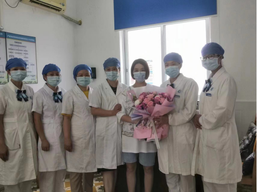 孕妇给保健中心的医务人员献上鲜花
