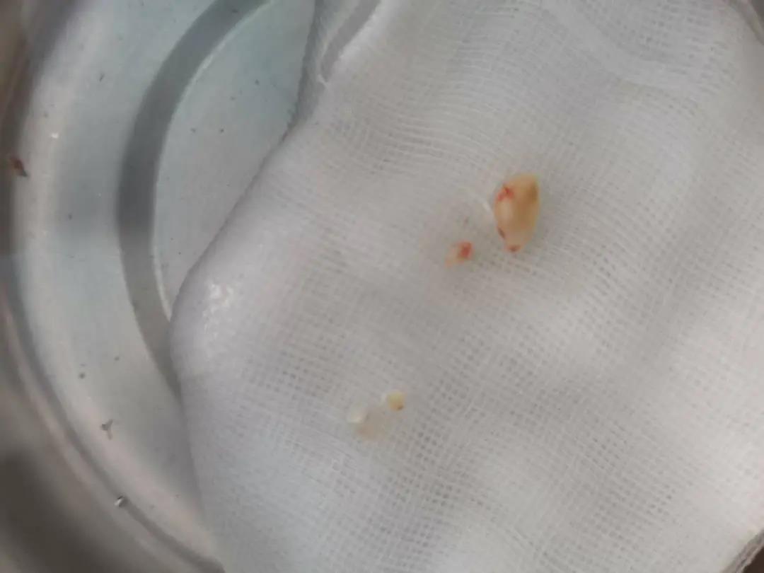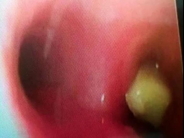 患儿家长即带到英德人医普儿科住院治疗。经过胸部CT检查,发现右肺主支气管--右肺上叶支气管处异物并阻塞性肺气肿可能。医生当即作出行纤维支气管镜检查的决定。在镇静+粘膜表面麻醉下,对患儿进行纤支镜检查,发现在患儿右主支气管开口处有一大小约为3mm×5mm的异物,由于出现病情时间长,异物外周有肉芽包裹并充血明显,用“异物回收篮”取出异物为花生米,吸尽碎末并灌洗 ,手术过程顺利。术后患儿喘息很快消失,精神状态和食欲大幅好转,经消炎治疗和精心护理康复出院。