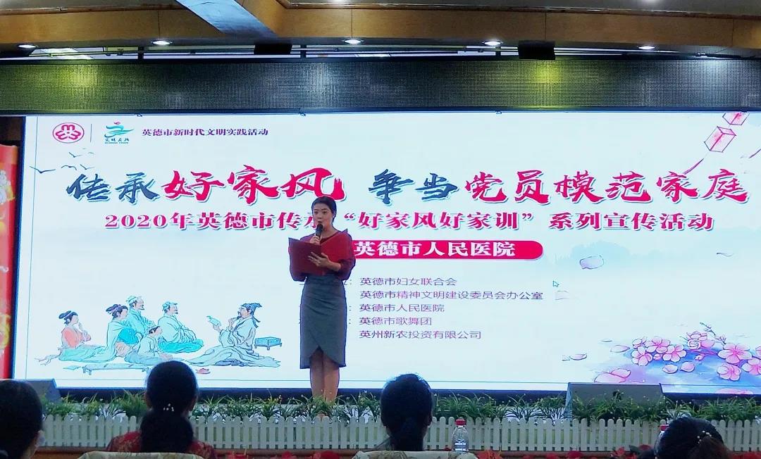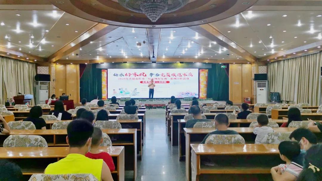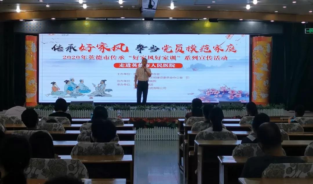 为贯彻落实习近平总书记关于“注重家庭、注重家教、注重家风”指示精神,深入培育和践行社会主义核心价值观,创建文明家庭新风。2020年8月27日,由英德市妇女联合会、市精神文明建设委员会办公室主办,英德市人民医院、英德市家庭教育促进会、英德市歌舞团承办的“好家风好家训”家庭教育系列宣传活动在人民医院行政楼五楼大会议室举行,近百名职工及职工子弟参加了此次活动。