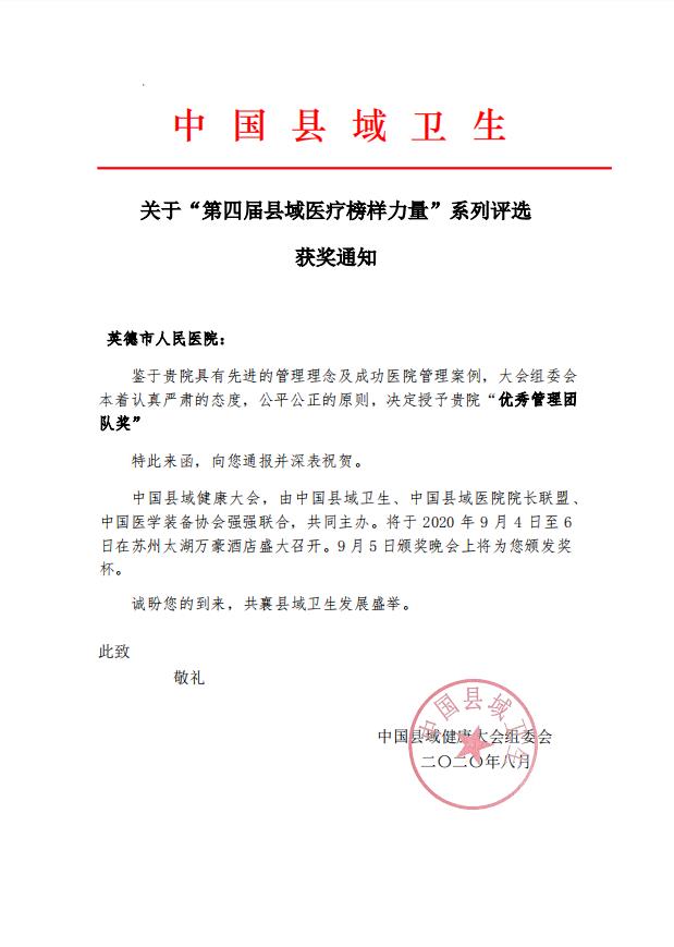 据了解,此次评选活动由中国县域卫生、中国县域医院院长联盟、中国医学装备协会共同主办。活动以2020年县域医卫人迎来的新挑战,新变局,新发展,见证县域逆行者风采,以及全国县域医院医改中涌现出无数县域榜样为背景,通过“致敬逆行者”、"赋能县域"、"县域医疗榜样力量”三个亮点环节,致敬抗疫英雄,致敬县域发展大时代,汇聚力量,号召县域医卫人带着时代新命题,向着更高的目标出发。经过严格、激烈的评选,英德市人民医院、安溪县第三医院、蕲春县人民医院、兴化市人民医院、晋江市医院、清河县中心医院、句容市人民医院、武安市第一人民医院、纳雍县人民医院、新绛县人民医院10家医院脱颖而出,获得“优秀管理团队奖”。