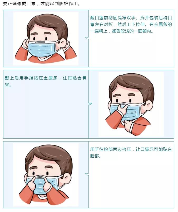 要正确佩戴口罩,才能起到防护作用。戴口罩前彻底洗净双手。拆开包装后将口罩左右对折,然后上下拉伸。有金属条的一端朝上,颜色较浅的一面朝内。戴上后用手指按压金属条,让其贴合鼻梁。用手往脸部两边挤压,让口罩尽可能贴合脸部。