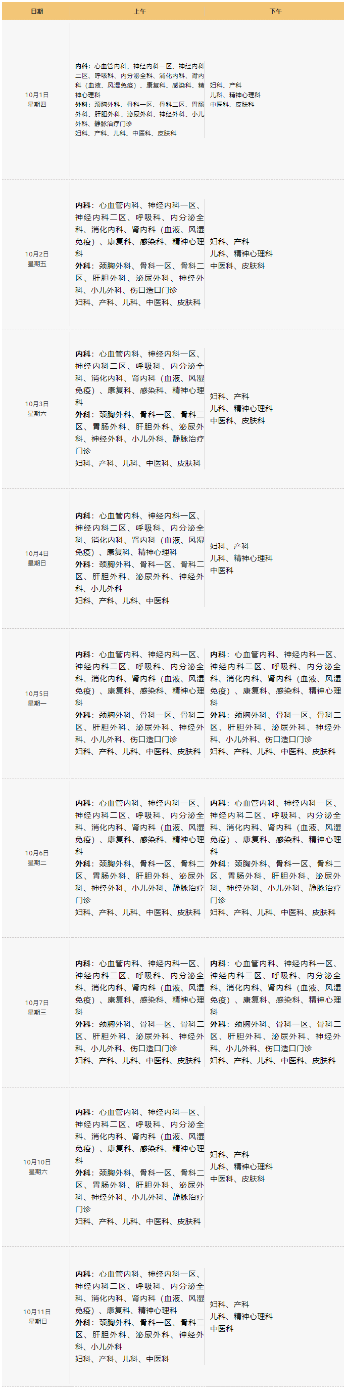 为了方便广大患者就诊,根据国务院办公厅有关节日放假安排的通知,结合我院的具体情况,现将我院2020年国庆节、中秋节期间综合门诊出诊安排公告如下: 英德市人民医院2020年中秋、国庆节综合门诊出诊安排 说明: 1、急诊科24小时开诊。 2、口腔科(综合门诊三楼)、眼科、耳鼻喉科(外科大楼11楼)照常开诊。 请大家做好就诊安排。 广东省英德市人民医院 2020年9月23日