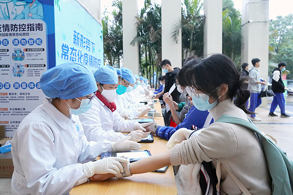 参加体检的学生们在医护人员的指引下,在各体检分区自觉排队,有序地接受健康检查。