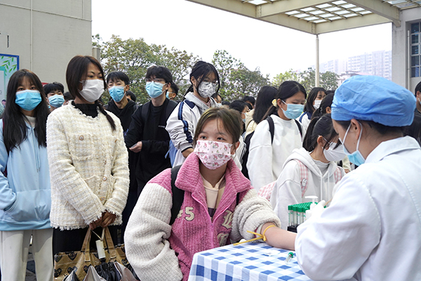 在外科住院楼前的采血区,一支由护士长为骨干力量的体检队伍紧张而有序地忙碌着采血、测血压。健康管理中心主任肖翠梅向参加体检的学生们讲解采血后的止血要领,并叮嘱学生们,如身体有不适的感觉,一定要及时向现场医务人员沟通。为确保参加体检的学生人身安全,采血区还设置了高考体检应急站,健康管理中心医护人员加强现场巡视,询问学生身体状况,若有学生身体出现不适,立即进行救治并完善下一步的体检流程。