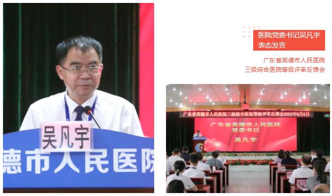 英德市人民医院党委书记吴凡宇在表态发言中郑重承诺:“我院对专家反馈的问题和指导意见,虚心接受、全部认领、照单全收。我们将认真梳理问题,摸清薄弱环节,以问题为导向,逐一整改落实,并举一反三,形成长效、常态化机制,不断提升医院科学化、规范化、精细化管理水平,推动医院高质量发展。”吴凡宇认为,等级医院评审既是对英德市人民医院行政管理、医疗、护理、药事、院感、后勤等各项工作的一次全面检阅,更是一次难得的、全方位的医院管理学习机会。专家们管理经验丰富,专业水平高超,作风求真务实,提出了许多中肯又切合我院实际的意见和建议,直击医院发展的“难点、痛点”,疏“堵点”、扫“盲点”,为医院全方位号脉,为今后的发展指明了方向和思路。专家们博学、严谨、细致、认真的作风,让我们深感敬佩。吴凡宇表示,英德市人民医院将以本次评审作为新的起点,全面贯彻落实党的二十大精神,将理论学习与工作实践相结合,始终坚持以人民健康为中心,以职工为核心,进一步强化医疗质量、提高医疗服务水平,护佑人民生命健康,为英德地区乃至周边粤北地区的老百姓提供更为优质的医疗服务,为健康英德、健康广东贡献更多的力量。