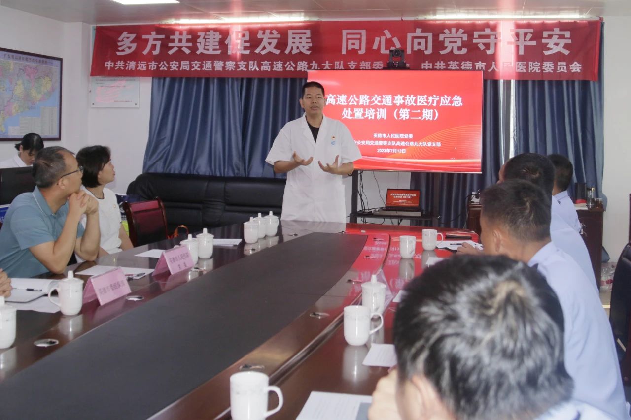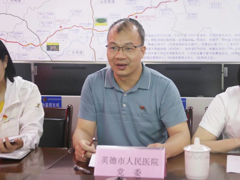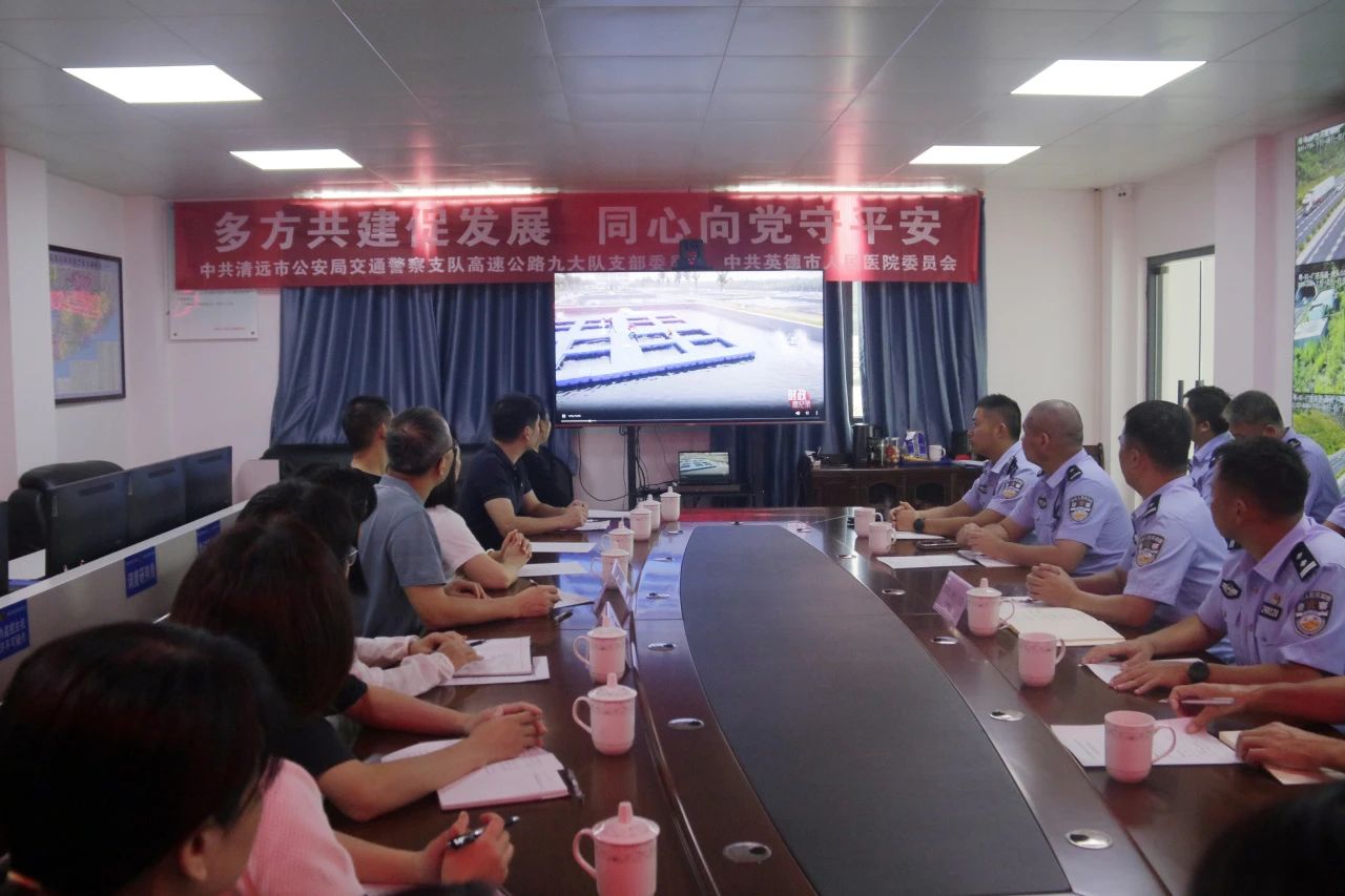 为深入学习贯彻习近平总书记关于新时代公安工作的重要论述,探索党建工作新模式,畅通医疗救治“绿色通道”,把爱警暖警工作做实做细,7月13日,在英德市委组织部的指导下,英德市人民医院党委组织党委副书记冯锡光与党员代表一行12人来到广连高速大湾服务区,与清远市公安局交通警察支队高速公路九大队党支部开展“多方共建促发展,同心向党守平安”支部共建系列活之二。