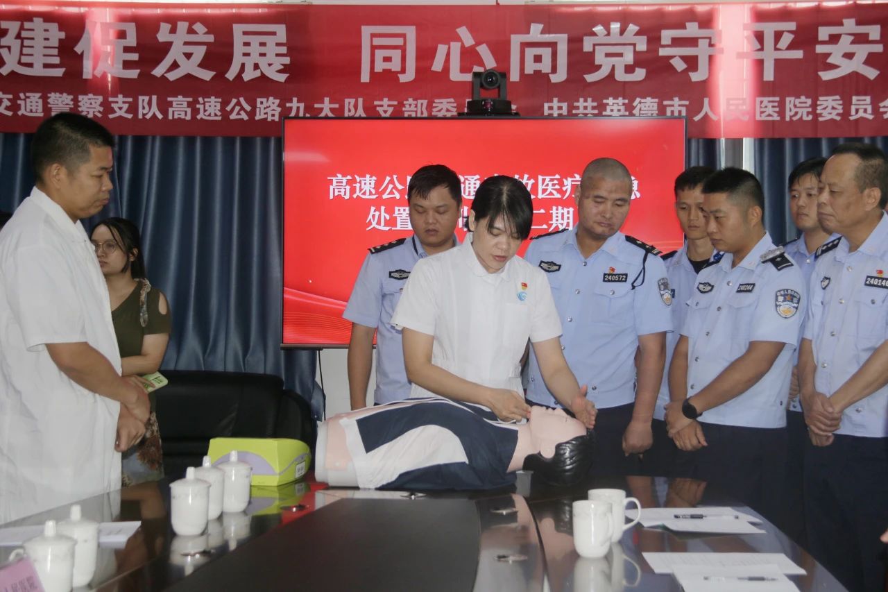 外科医护专家陈志权、胡青雯进行了第二期医疗应急处置培训,讲解了海姆立克急救法和AED(自动体外除颤器)的正确使用等内容,“手把手”教学,让现场警员在短时间内就掌握了基本的急救技能,为群众的交通安全提供多一份暖心守护。