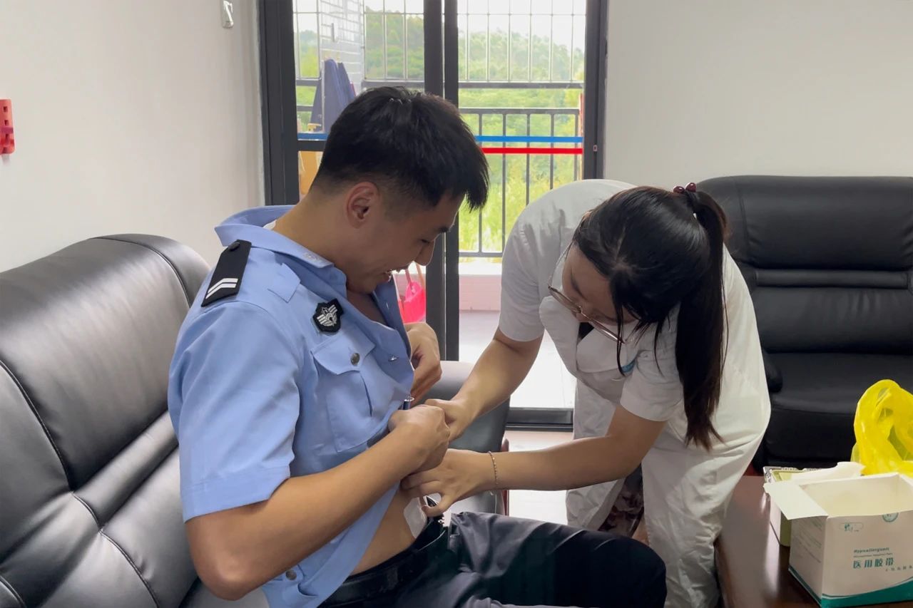 英德市人民医院党委聚焦交警队伍身心健康和所盼所需,安排中医科专家团队,根据交警的工作特点,赠送量身定制小暑保健节气方和安排“三伏贴”,由中医科刘莹医师现场讲解小暑节气的保健知识和三伏贴功效。同时派出体检车来到大湾服务区,免费为交警高速九大队的警员开展B超、心电图等体检项目,为忠诚的人民卫士提供健康保障。暖暖的“三伏贴”,甜甜的“节气方”,细心的体检,英德市人民医院党委送来这一系列走心的健康服务,得到现场警员的一致好评和称赞。