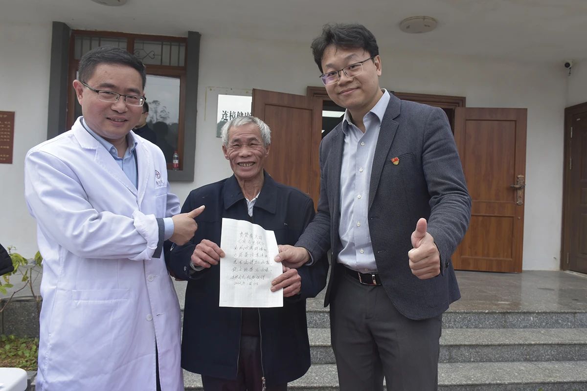 当地村民陆新福特别用情用心,在咨询现场,撰写藏头诗两首,分别赠送给南方医院和英德市人民医院,以表达他的浓浓谢意。现场的专家和党员同志都深受感动,为质朴纯真的民风民情点赞!