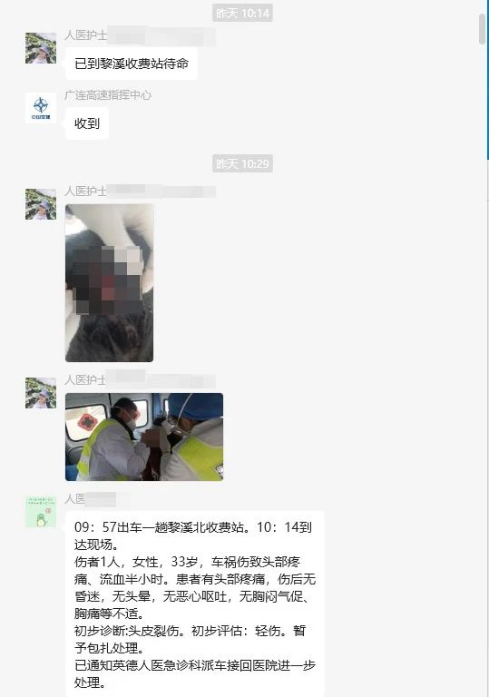 英德市人民医院水边服务区医疗保障服务驻点急救医务人员立即出车。