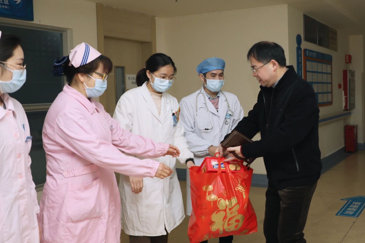 “新年好!大家辛苦了!”吴凡宇与副书记江智明,副书记、副院长冯锡光等先后来到病案科、妇科、五官科、泌尿外科一区、泌尿外科二区、儿科、普通外科一区、普通外科二区、普通外科三区、骨科一区、骨科二区、颈胸外科、神经外科、制氧机房、产科、麻醉科、重症医学科等处,向坚守岗位的医务人员、后勤人员致以节日的问候,赠送新年礼物,亲切交谈,了解春节期间的医疗保障、后勤保障等有关情况。感谢他们在新春佳节放弃与家人团聚,坚守岗位,保障人民群众度过一个平安、祥和的春节。并叮嘱他们继续以高质量的工作水准,守护好人民群众健康安全。