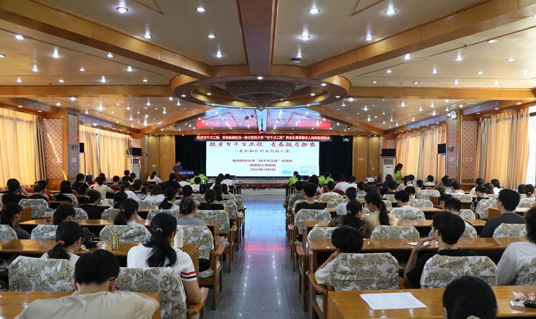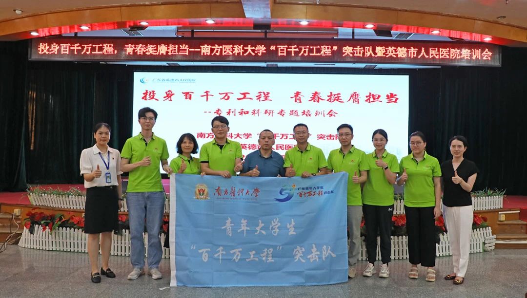7月9日,南方医科大学团委副书记、创业学院院长张清宇率领“百千万工程”突击队,到英德市人民医院开展“投身百千万工程,青春挺膺担当”专利和科研专题培训会。英德市人民医院副院长刘伟波、李东(省医帮扶团队队长)、团委书记胡青雯出席培训会。英德市医共体成员单位、医院各学科骨干代表、青年团员、在院实习生共200余人参加培训会。