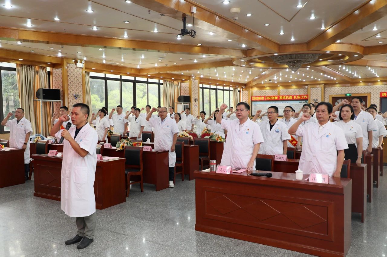 梁德坚带领现场医师庄严宣誓。医师们高举右手,句句誓言铿锵有力,振奋人心,充分展现了医者应有的风采与担当。