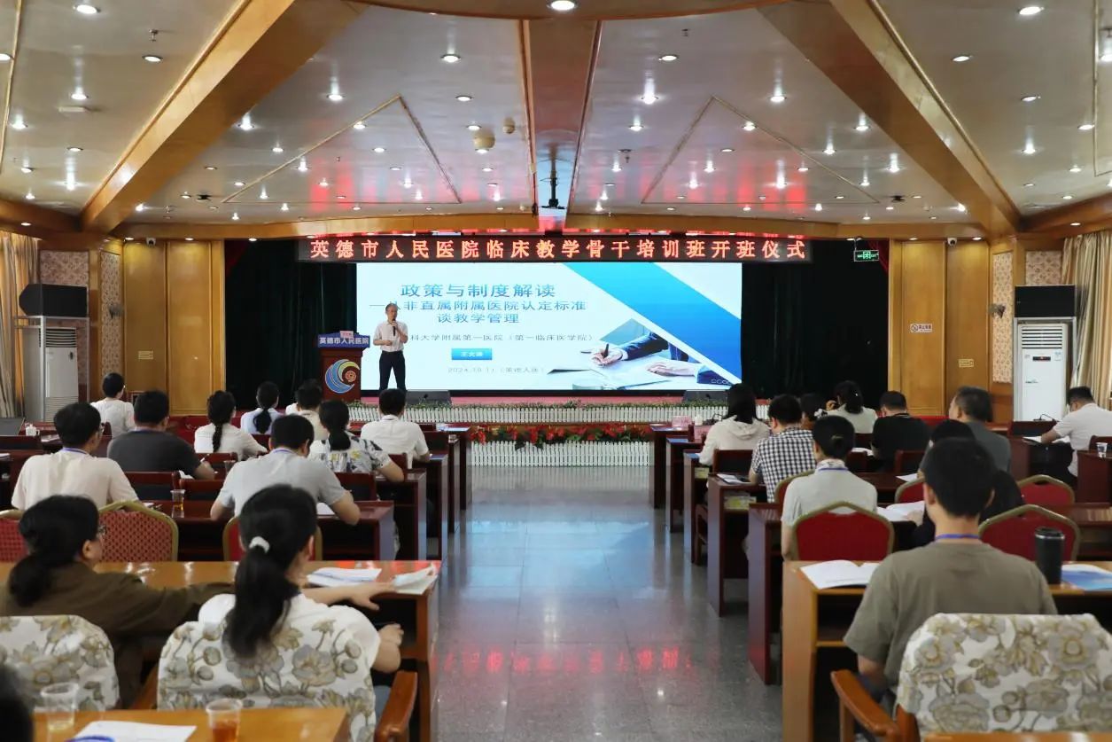 开班仪式结束后,广东药科大学附属第一医院王文涛教授进行了《政策与制度解读——从非直接附属医院认定标准谈教学管理》的主题授课。
