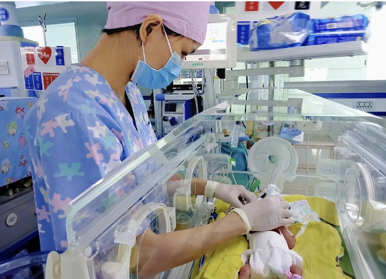 2024年11月,英德市人民医院新生儿科收治了一名超早产儿——出生时仅26周+,体重0.85公斤(1斤7两),几乎只有成人手掌大小。小豆丁(化名)刚来到世界,就被送进了新生儿重症监护室(NICU),开始了一场漫长的“生命接力”。