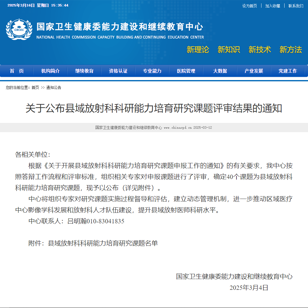 近日,国家卫生健康委能力建设和继续教育中心下发《关于公布县域放射科科研能力培育研究课题评审结果的通知》,英德市人民医院影像中心科研项目《CTP联合ASPECTS评分预测取栓术后风险的研究》获科研资助,成为广东省仅有的2个获批课题之一。据悉,在全国千余所县级医院中,本次仅有40个课题获得资助。该项目的成功立项,为英德区域医教研水平的提升注入了强大动力!