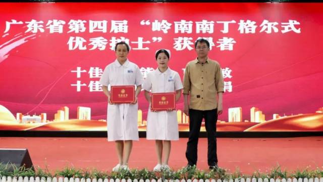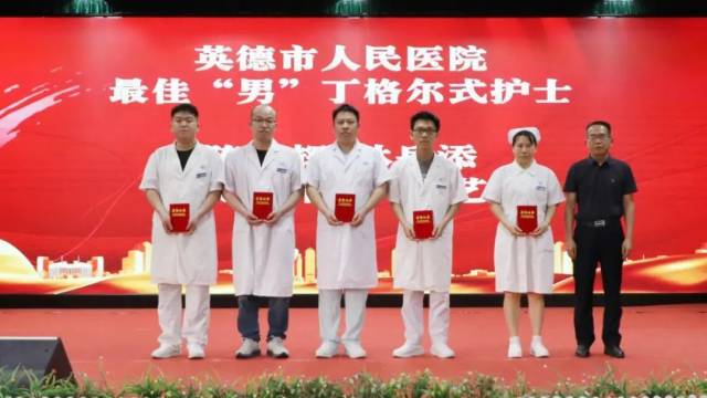 医院党委委员吴继营(右一)为英德市人民医院“最佳‘男’丁格尔护士”获得者颁发荣誉证书。