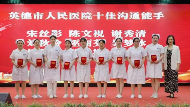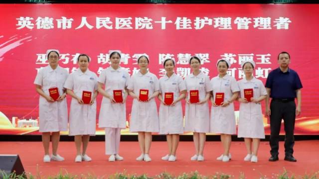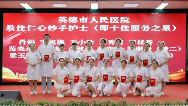 护理部主任许素芃(后左一)、副主任刘贤团(后右一)为英德市人民医院最佳仁心妙手护士(即十佳服务之星)获得者颁发荣誉证书