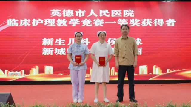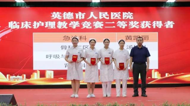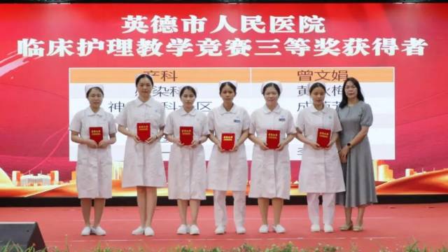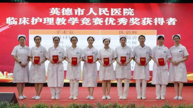 护理部副主任黄丽琴(后左一)、主任助理陈慧翠(后右一)为英德市人民医院临床护理教学竞赛优秀奖获得者颁发荣誉证书
