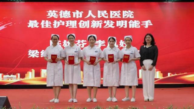 医院工会副主席黄梦芝(右一)为英德市人民医院“最佳护理创新发明能手”获得者颁发荣誉证书。