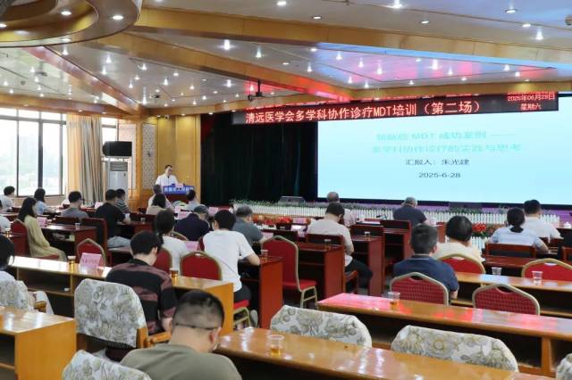 会议围绕MDT规范化建设与基层实践开展专题培训,周海波教授作《MDT的昨天、今天与明天》主题授课,系统梳理MDT发展历程,剖析其在现代医疗体系中的核心价值,提出未来学科建设与融合的展望。清远市人民医院质控科科长朱奕、胸外科主任胡宁东,英德市人民医院党委副书记、副院长冯锡光,泌尿外科副主任医师朱光建分别进行专题授课,分享MDT团队建设、制度优化及质量评价体系的成功经验。