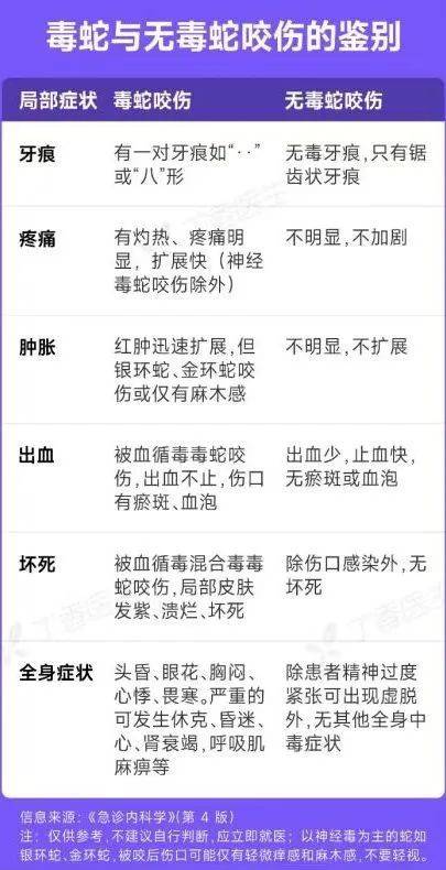 (2)紧急就医:尽量记住蛇的基本特征,包括蛇形、舌头、花纹、颜色,最好可以拍照,以便医生精准用药。不要去捕捉或追打蛇,以免二次被咬。最佳治疗时间:咬伤后2小时内注射血清,最晚不超过24小时。毒蛇的咬痕一般表现为1~4个出血点,多数情况为2个;无毒蛇为两排细小牙痕。