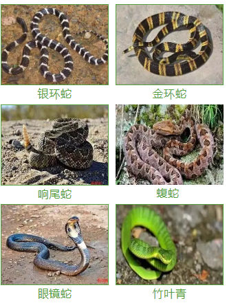 我国有160余种蛇类,其中包括50余种毒蛇,有剧毒、危害巨大的有10种,如眼镜王蛇、眼镜蛇、金环蛇、五步蛇、银环蛇、蝰蛇、蝮蛇、竹叶青、烙铁头、海蛇等。