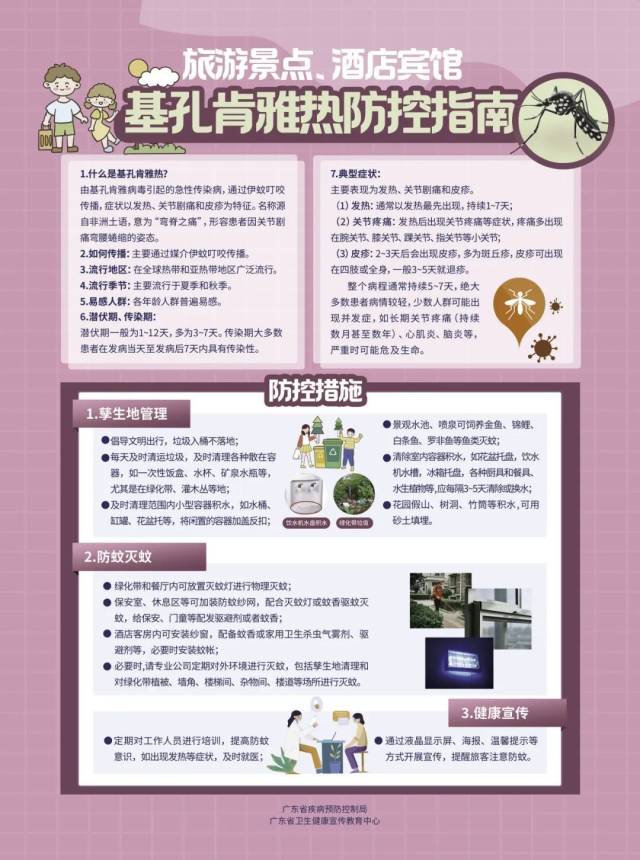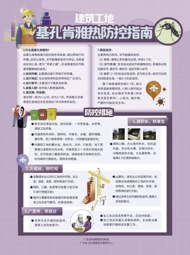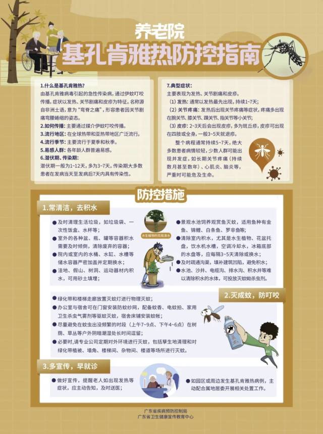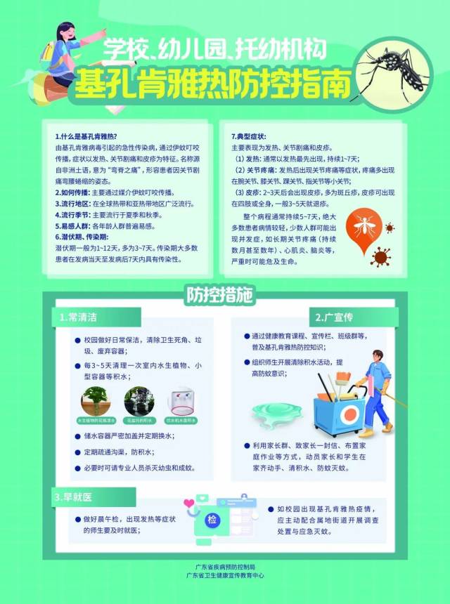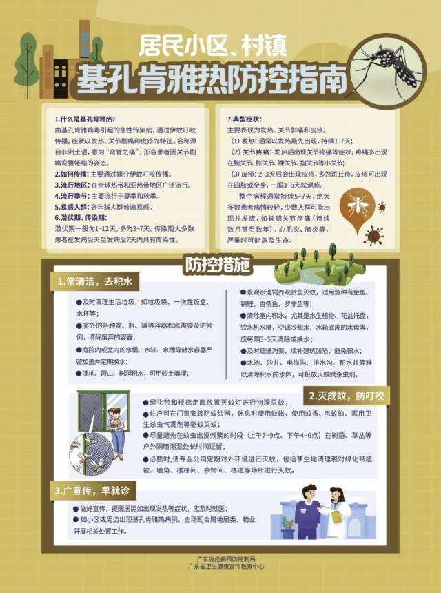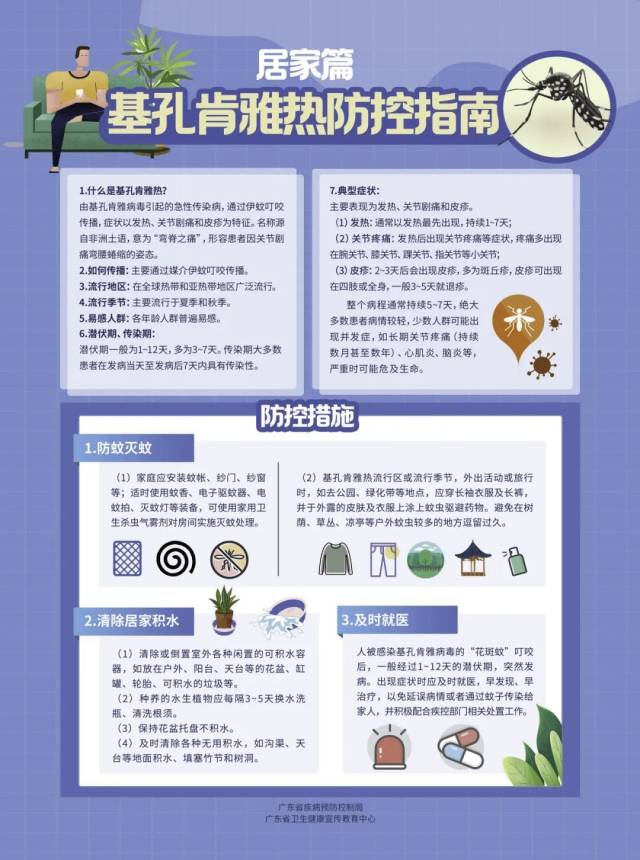 基孔肯雅热 是经伊蚊叮咬传播的急性传染病 通过“清积水、灭成蚊、防叮咬” 可有效降低疾病传播风险 如何预防基孔肯雅热? 收好这份权威防控指南 ↓↓↓ 居家篇 居民小区、村镇 学校、幼儿园、托幼机构 建筑工地 医疗机构 养老院 旅游景点、酒店宾馆 口岸、机场