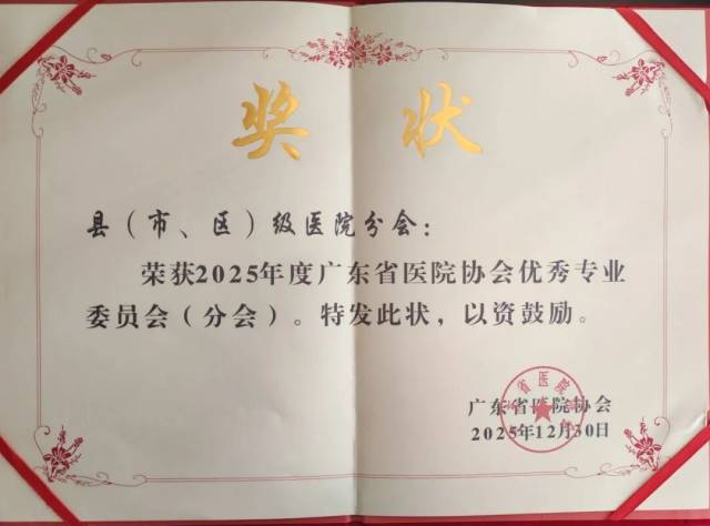 12月30日,2025年广东省医院协会分支机构工作总结会议在广州召开。会上,县(市、区)级医院分会凭借在组织建设、学术交流与行业服务等方面的扎实成效,获评为2025年度“优秀专业委员会(分会)”。
