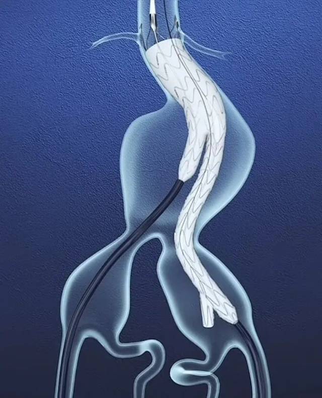 封印了危险的分支后,真正的“重头戏”开始了。介入团队在老伯体内植入了一套“裤衩形”覆膜支架(分叉支架)。由于支架需要精准覆盖主动脉分叉处,形状神似我们穿的裤子。这件坚固的“铠甲”在血管内缓缓张开,上接腹主动脉,下连双侧髂动脉,将薄弱的瘤体隔绝在血液冲击之外,重新构建了一座稳固的生命桥梁。