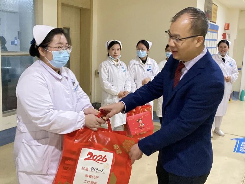 随后,慰问组走进病房,为住院患者及家属送上慰问品与新春祝福,细致询问病情恢复、饮食起居等情况,鼓励大家安心治疗、早日康复。