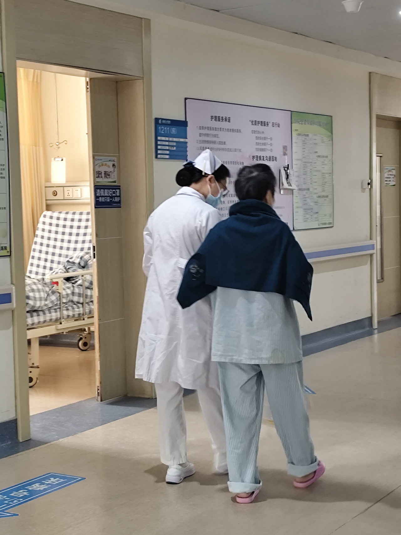 她轻柔地扶着老人手臂的动作,是医院里最温柔的“支撑”——既帮老人稳住了身体,也给了他安心的依靠。