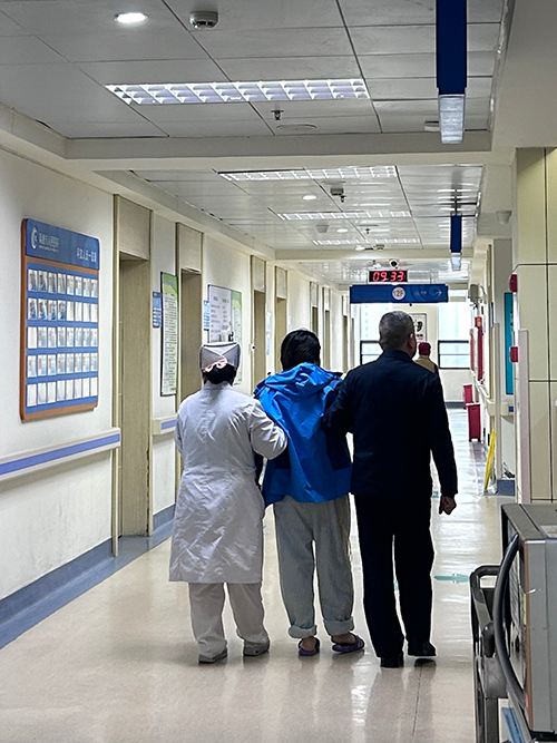 她温柔而坚定地搀扶着术后患者,以暖心鼓励与耐心陪伴,一步一步在走廊里练习离床活动。白大褂轻轻擦过患者的胳膊,恰似一双温柔的手,将术后的疼痛与不安慢慢抚平。