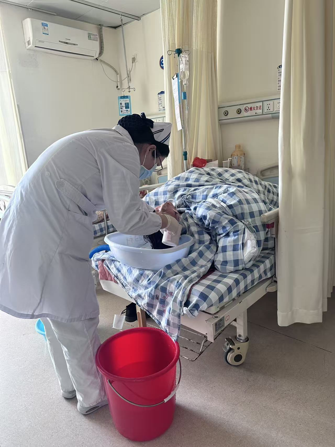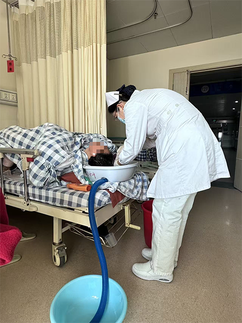 她细心地弯腰,为术后患者轻柔洗头。那些术后的疲惫与不适,仿佛也被这温柔的水流一点点带走。