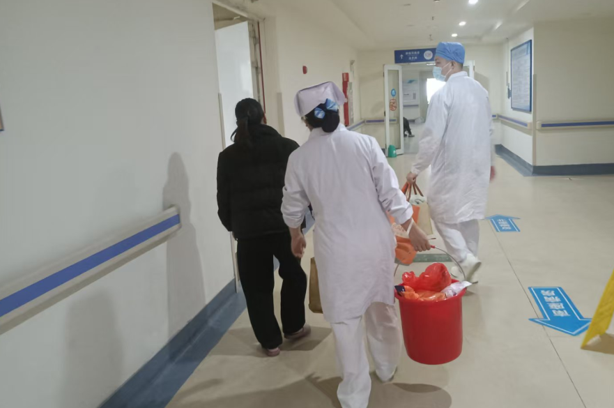 她提着红桶,和医生一道,细心地帮出院患者搬运行李与生活用品。小小的红桶里,装的不只是日常物件,更是一路相伴的牵挂与用心。