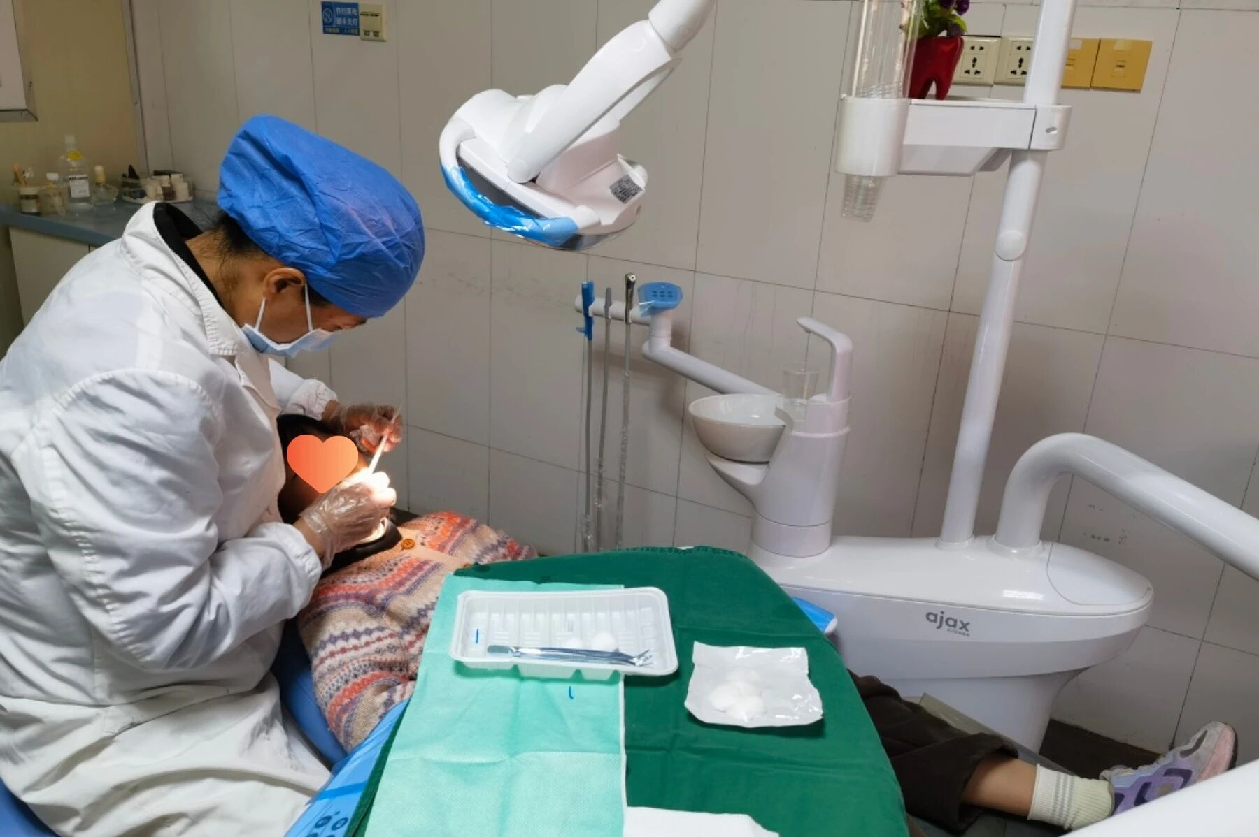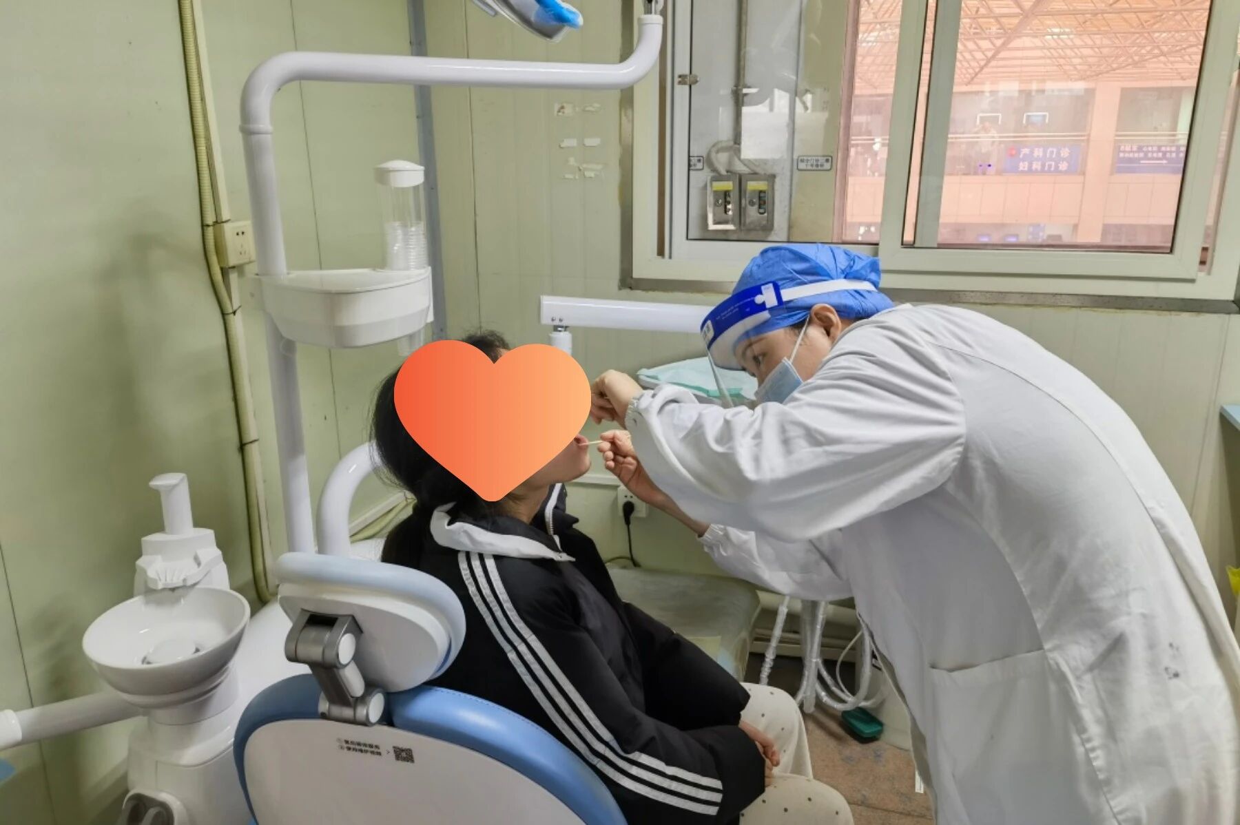 她专注地俯身,用棉签轻触患者口腔,为牙齿正畸患者认真检查,目光里满是细致与耐心。