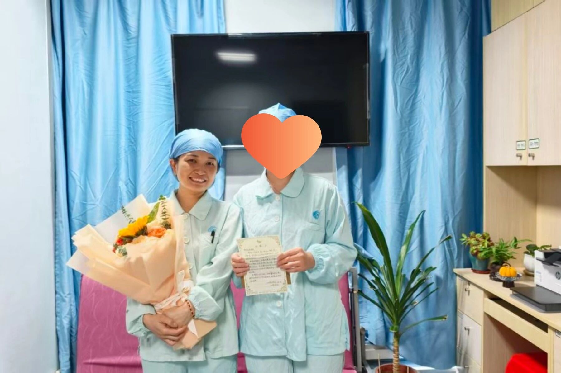 她与患者的身影紧紧相依,不急不赶,安稳而踏实,治愈了患者的心,温暖了整个病房。