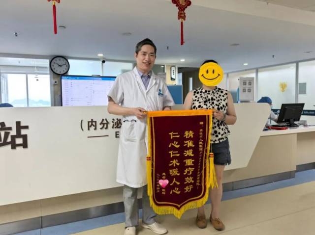 近日,英德市人民医院内分泌科收到一份特殊的感谢——患者张女士(化名)将一面镌刻着“精准减重疗效好,仁心仁术暖人心”的锦旗,亲手送到科室医护团队手中。用最真挚的方式致谢医护人员帮助她从147斤减至125斤,成功减重22斤!摆脱肥胖困扰,重新收获健康与自信。