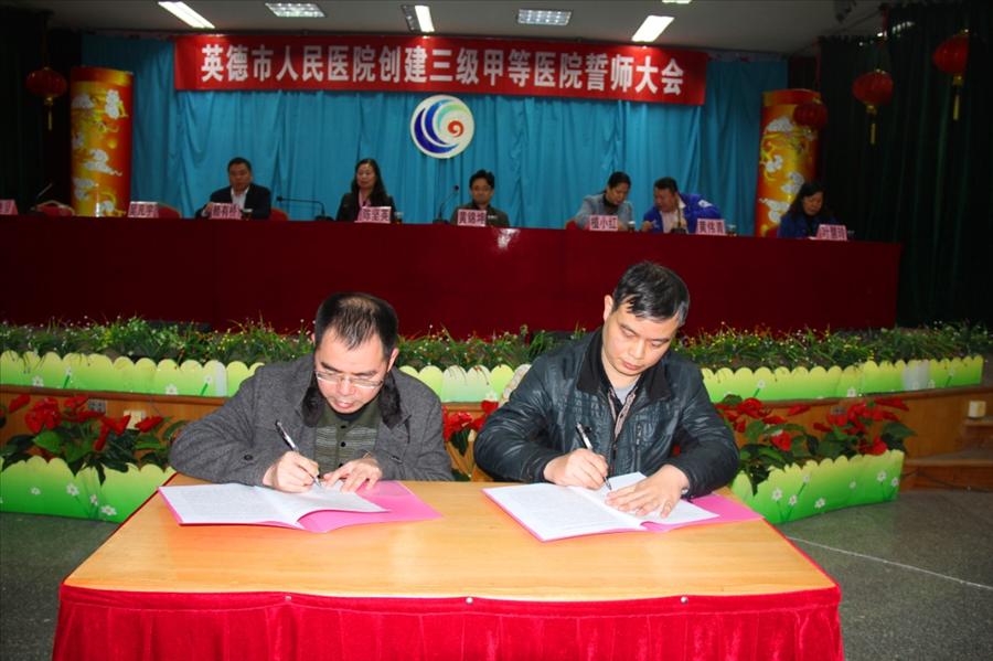 在此次大会上,神经内科一区、骨科分别签订了《英德市人民医院创建三级甲等医院目标责任书》,这标志着冲刺“三甲”的号角已经吹响。2016年,是英德人医全面创建“三甲”医院的攻坚之年。医院将以此次誓师大会为契机,内强素质,外塑形象,增强凝聚力,做到“日常工作三甲化,三甲工作日常化”,提升医院的整体水平,为英德群众的健康服务。