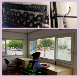 警务室由公安局巡逻警察大队派驻警务人员和医院保安中队排班值守。在人员配置齐全的情况下,“技防”更是保障医院安全的重要环节,在警务室内部可以看到,除电脑、办公桌椅、文件柜、警务公示栏、法制宣传栏等常备设施外,头盔、防暴叉、强光手电、对讲机等技防设施也很完善。特别是视频监控系统,英德市人民医院院区安装了大量高清摄像头,对院区道路、办公楼、护士站、门诊大厅、病房等重点区域进行监控,监控中心24小时专人值守。