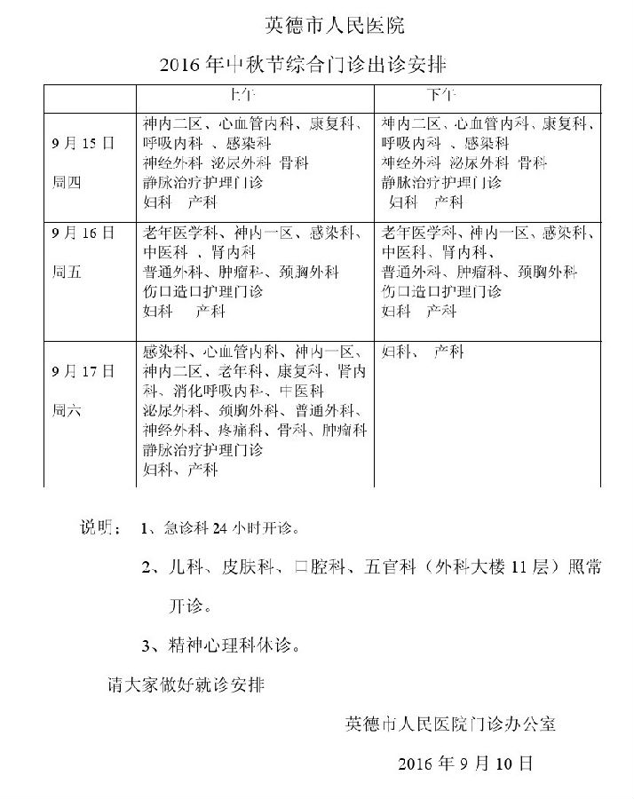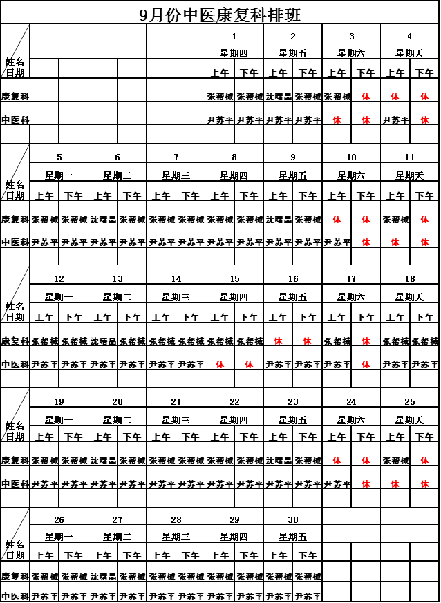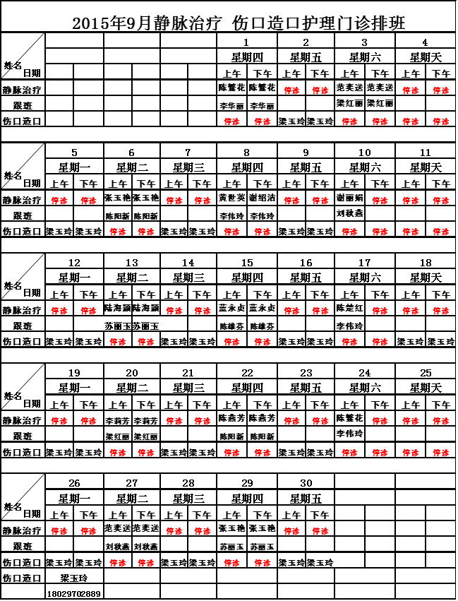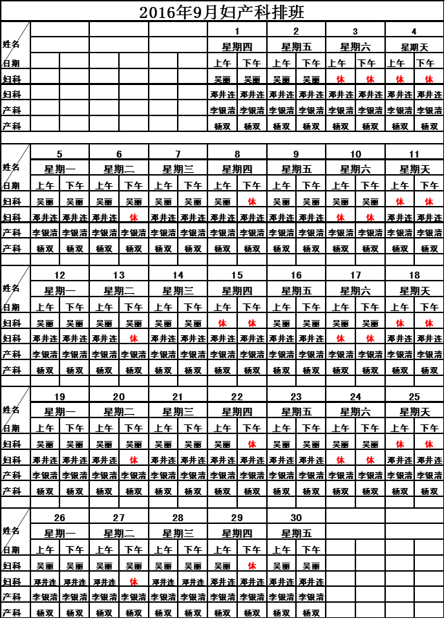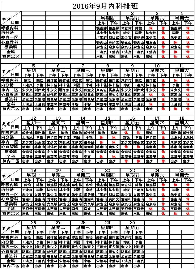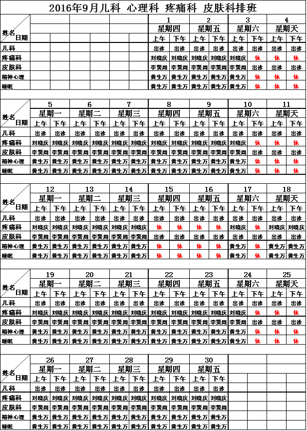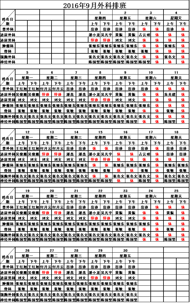 2016年9月门诊排班