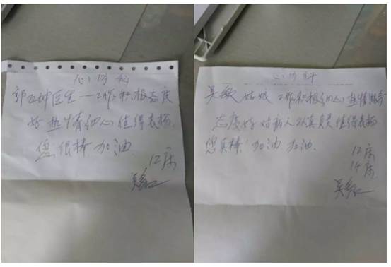 78岁的患者吴老伯,因患有冠心病合并糖尿病,多次到人医心内科住院治疗,为了感谢管床医生郭飞坤和护士吴敏,由于不善言辞,他用桌面的2张纸,写下了内心所想说的话,投进心内科的意见箱。护士的打开意见箱的时候,看似普普通通两张纸,打开看到的却是满满的温暖。