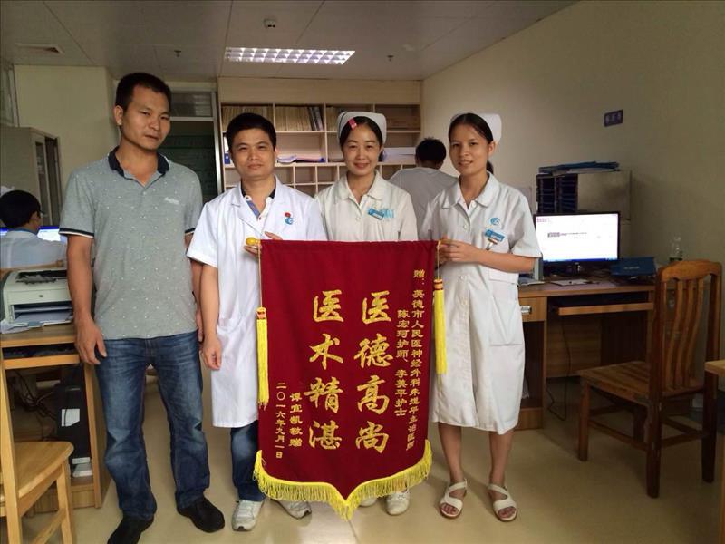 ①8月31日上午,12岁患者的小凯康复出院了,他的父亲带着“医德高尚、医术精湛”的锦旗,找到了神经外科朱道平医生,以及陈宏珂、李美平护士,赠送锦旗并合影留念。今年4月4日,小凯因车祸致伤头部,一直昏迷不醒,经抢救入医院神经外科监护室治疗两天,脱离生命危险后,小凯转到了神经外科病房继续住院治疗。在小凯昏迷的几个月中,守护在他身边的是神经外科的医护团队和他的爸爸,漫长的等待使这位年轻的父亲倍受煎熬,往日快乐幸福的家庭,笼罩着伤心和焦虑。6月8日,昏迷了65天的小凯终于醒过来了,小凯的父亲按捺不住内心的激动,两眼湿润一边紧握着小凯的手,一边呼叫医生......。是神经外科医疗团队精湛的医术、专业的护理,以及耐心和爱心的服务,让小凯重获新生,他们用行动诠释着医者父母心,谱写着一个又一个与死神斗争的感人故事!