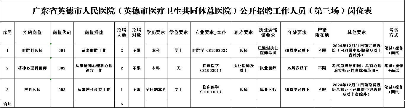 广东省英德市人民医院(英德市医疗卫生共同体总医院)因业务发展需要,面向社会公开招聘工作人员5名,现将有关事项公告如下: