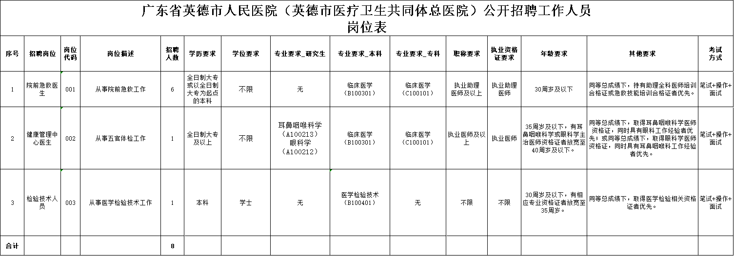 广东省英德市人民医院(英德市医疗卫生共同体总医院)因业务发展需要,面向社会公开招聘工作人员8名,现将有关事项公告如下: