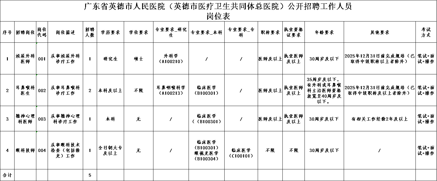 广东省英德市人民医院(英德市医疗卫生共同体总医院)因业务发展需要,面向社会公开招聘工作人员5名,现将有关事项公告如下: