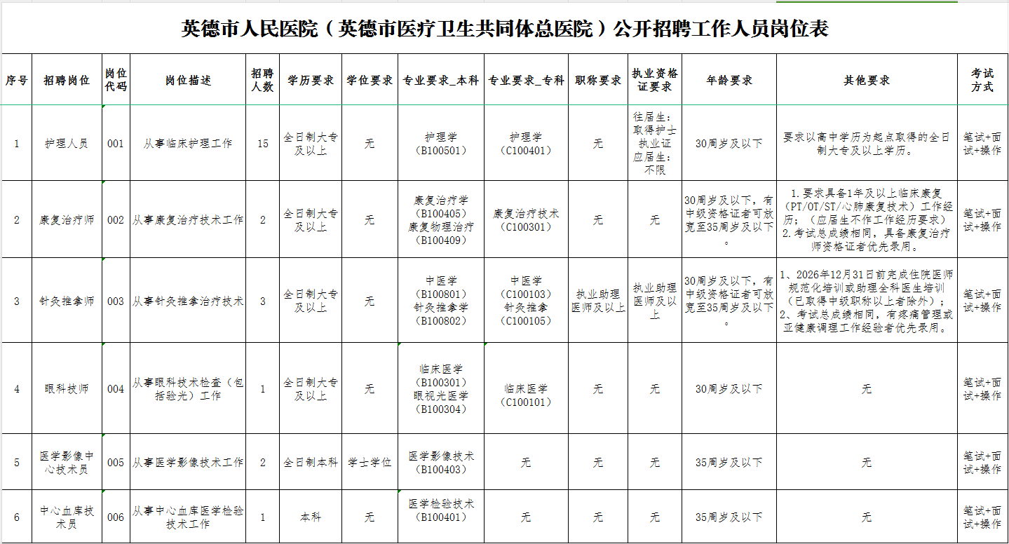 2.笔试地点:英德市人民医院(具体考场安排以医院人力资源部通知为准);